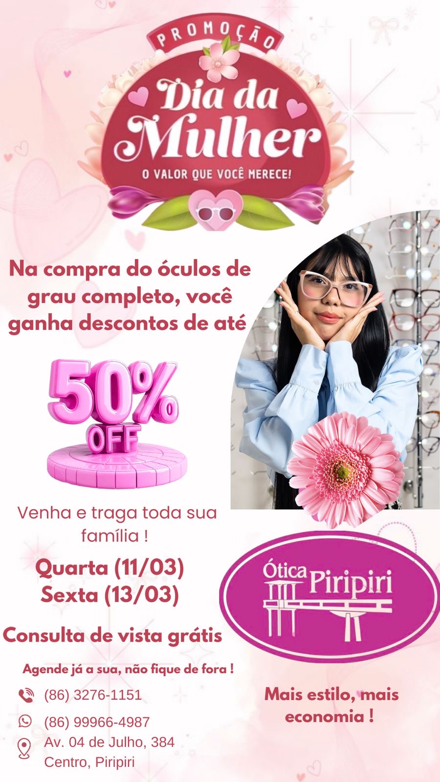 A Ótica Piripiri está com uma promoção especial em comemoração ao Dia da Mulher, oferecendo condições imperdíveis para quem deseja renovar os óculos com mais estilo e economia. Se inicia nesta segunda (09) e segue até sexta-feira (13).