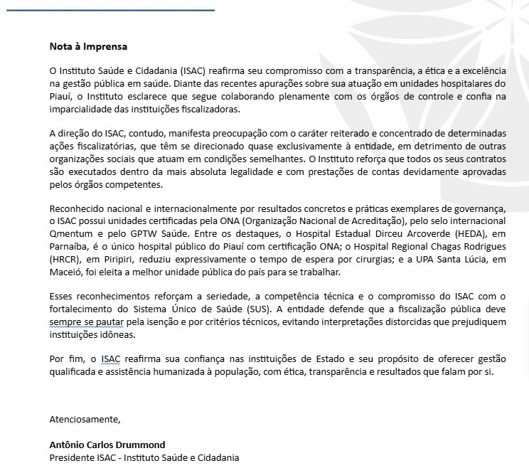 ISAC questiona seletividade em fiscalizações da CGU e pede isonomia entre Organizações Sociais no Piauí