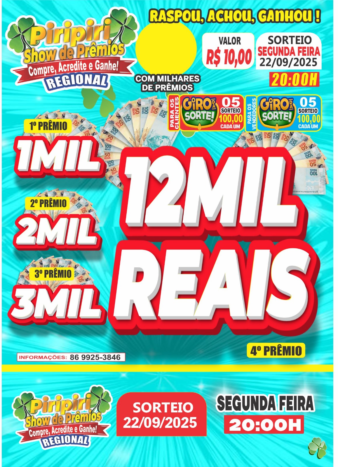 Na próxima segunda-feira, dia 22 de setembro, haverá mais sorteios, incluindo um prêmio principal de R$ 12.000,00 e mais três outras premiações.
