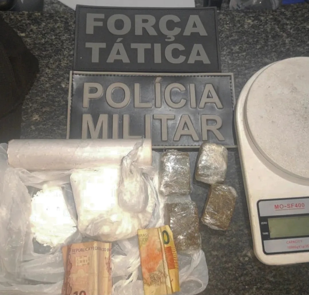 Durante patrulhamento, os policiais avistaram um homem que, ao perceber a viatura, tentou fugir utilizando uma bicicleta. A equipe conseguiu alcançá-lo e realizar a abordagem. Com o suspeito foram encontrados 77 gramas de cocaína, 46 gramas de maconha, uma balança de precisão e a quantia de 30 reais em dinheiro.